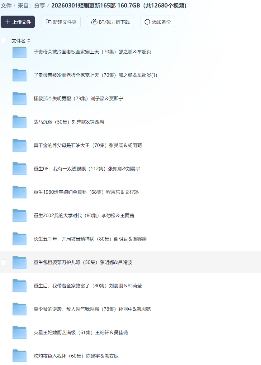 6、【短剧】20260301短剧更新165部 160.7GB(共12680个视频)免费观看全集高清网盘资源