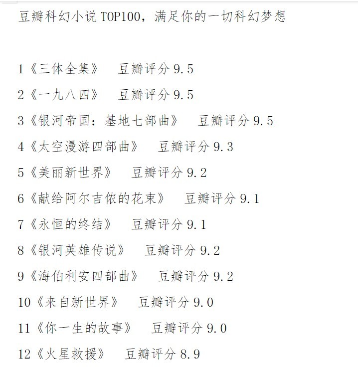 1、本贴标题:豆瓣科幻书单300部+电子书合集,收录中外经典科幻小说 题材丰富 内容丰富 [219MB]